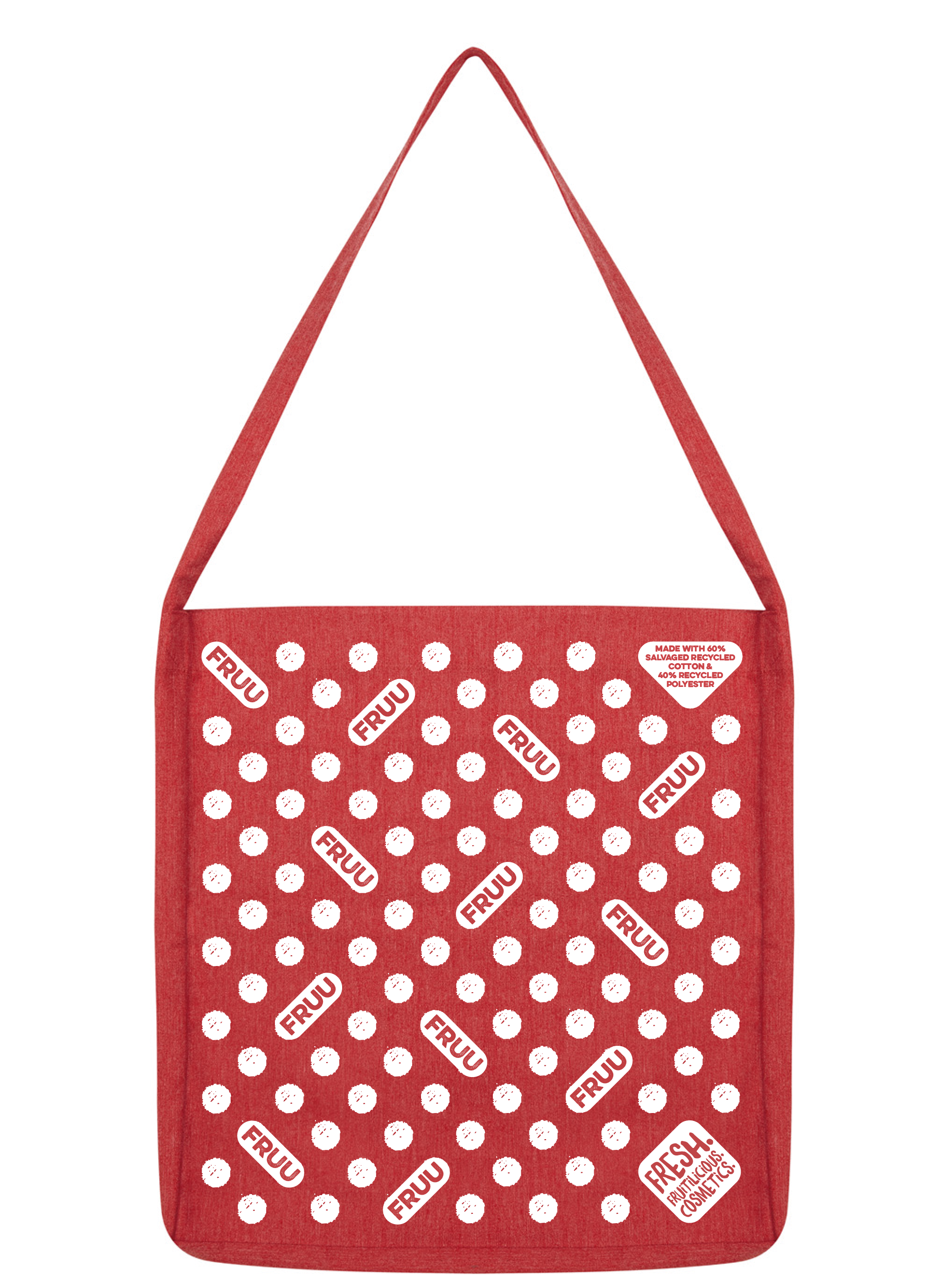 Not your average boring tote bag! Our FRUU.. bag is sustainably made with salvaged cotton (wasted offcuts), recycled polyester and vegan ink